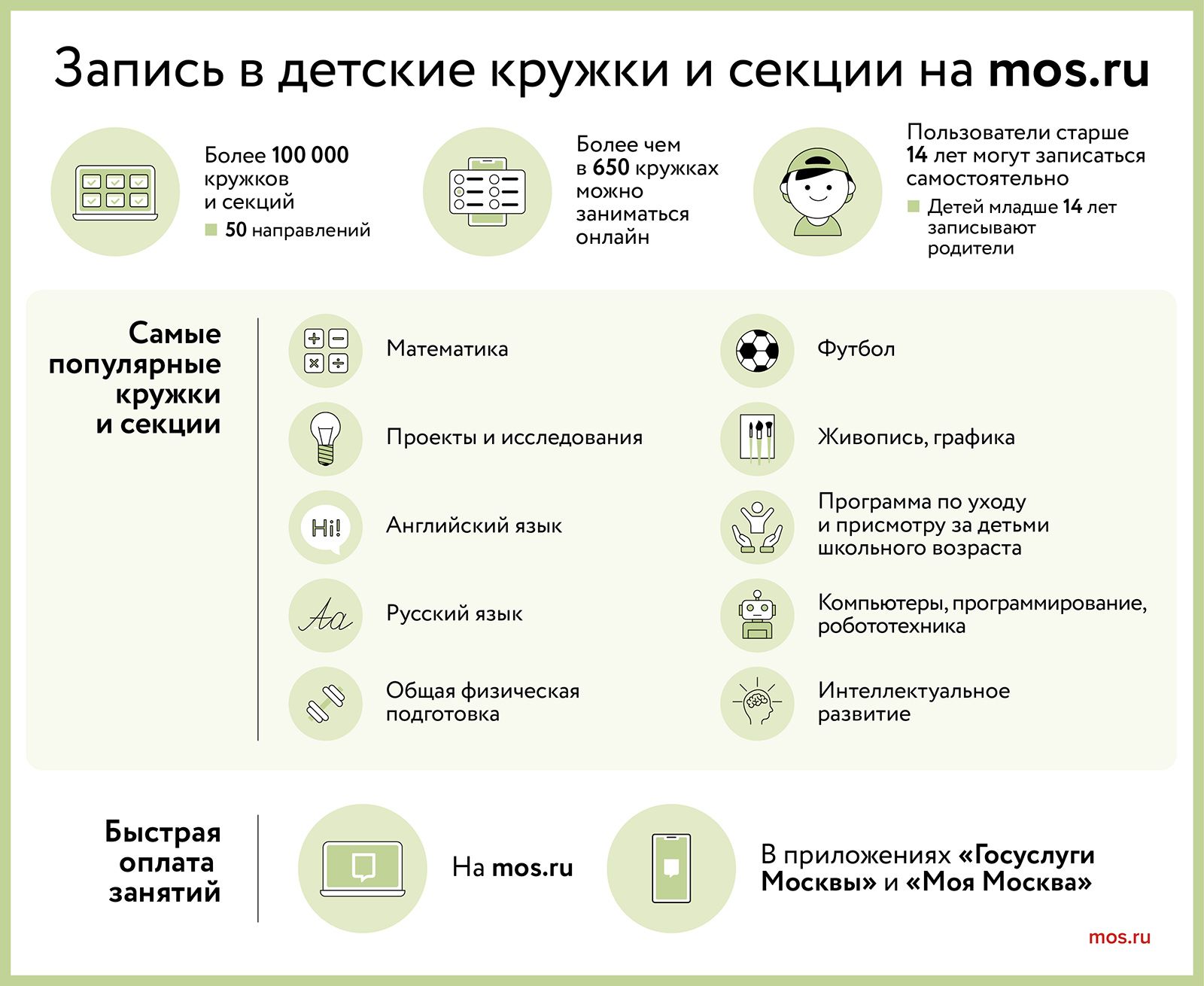 Чтобы записаться, нужно перейти в раздел «Образование», далее — в подраздел «Допобразование», а оттуда — в суперсервис «Запись в кружки, спортивные секции и школы искусств». Сервис для записи в кружки также открыт для родителей в разделе «Школа» электронного дневника «Московской электронной школы» («МЭШ») или в мобильном приложении «Дневник “МЭШ”».