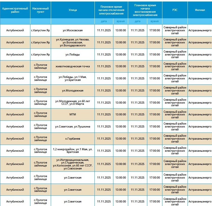 Без электричества на несколько часов останутся десятки улиц в городах Астрахань и Харабали, а также в четырех селах Приволжского, Ахтубинского и Икрянинского районов.