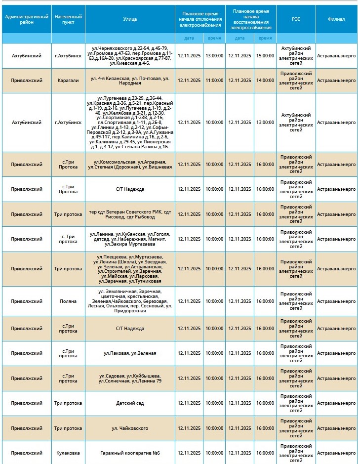Без электричества на несколько часов останутся десятки улиц в городах Астрахань и Ахтубинск, а также в семи селах Приволжского, Икрянинского и Наримановского районов.