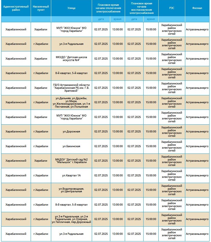 Как пояснили в ресурсоснабжающей организации, завтрашние отключения будут плановыми. И связаны они с проведением технических работ. В этот раз энергетики сосредоточат свое внимание на городах Астрахань, Камызяк и Харабали. А еще на девяти селах и поселках, расположенных в Наримановском, Камызякском, Приволжском и Икрянинском районов. Точнее, на нескольких улицах, список которых представлен в таблице ниже.