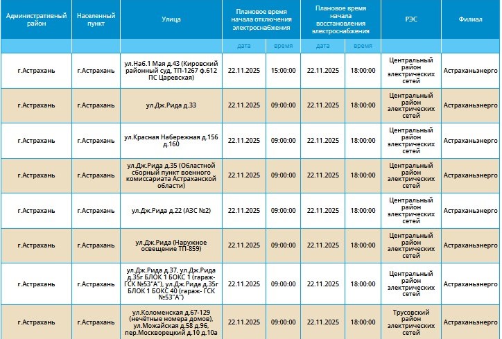 22 ноября массово отключат свет жителям Астрахани