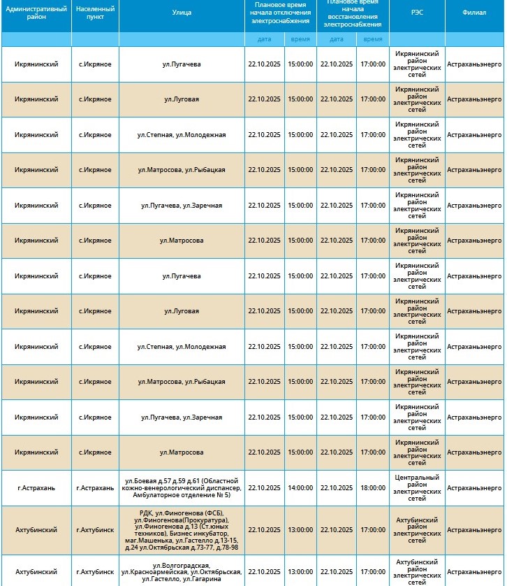 Массовые перебои в электроснабжении продолжатся и в среду. 22 октября отключение света грядет в ряде населенных пунктов Астраханской области. Astrakhanpost.ru выяснил, какие из них попали в число «счастливчиков».