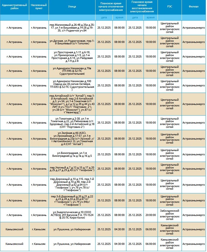 25 декабря отключение света коснется Астрахани и двух райцентров