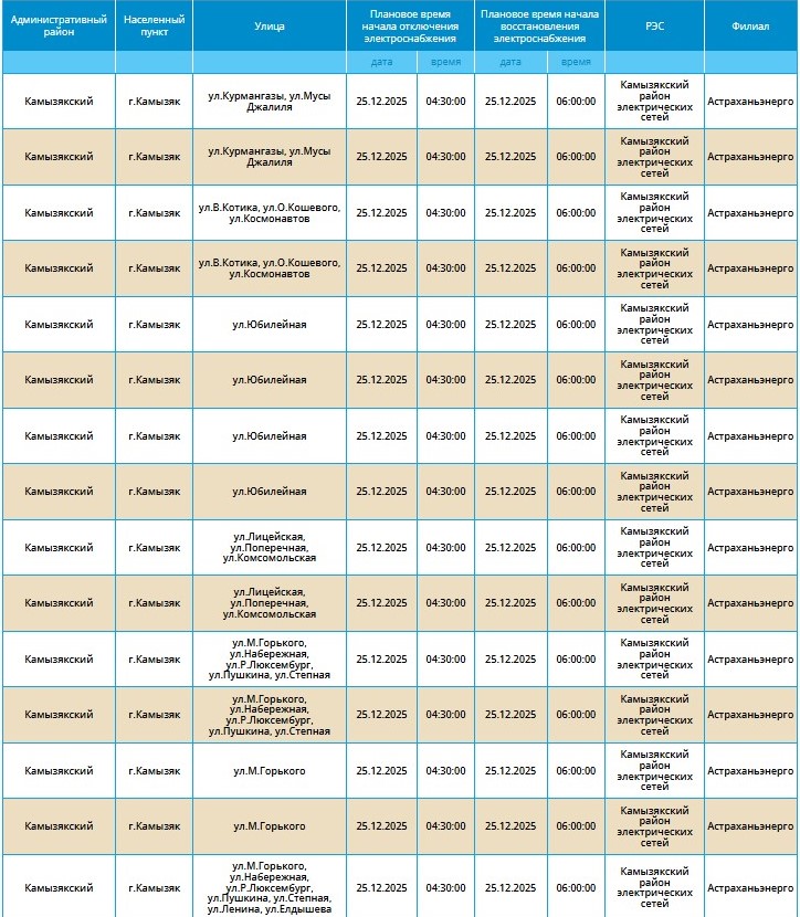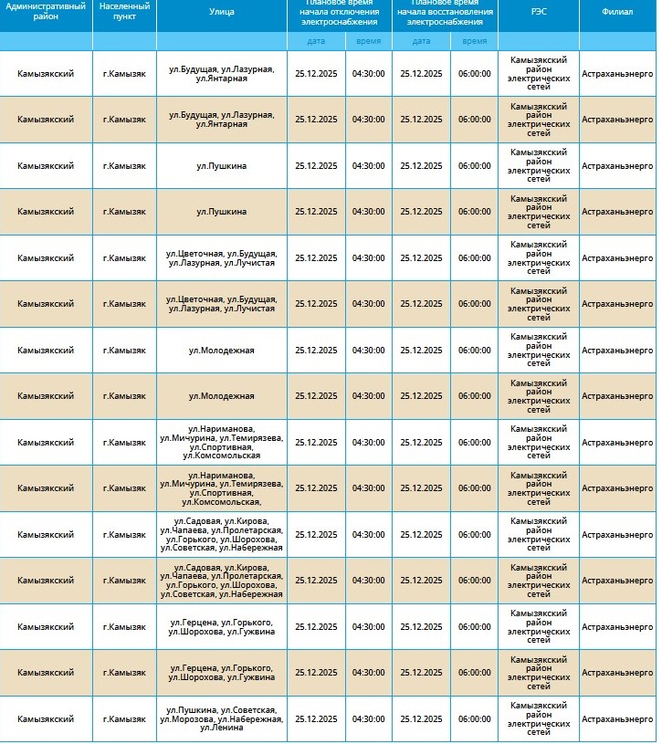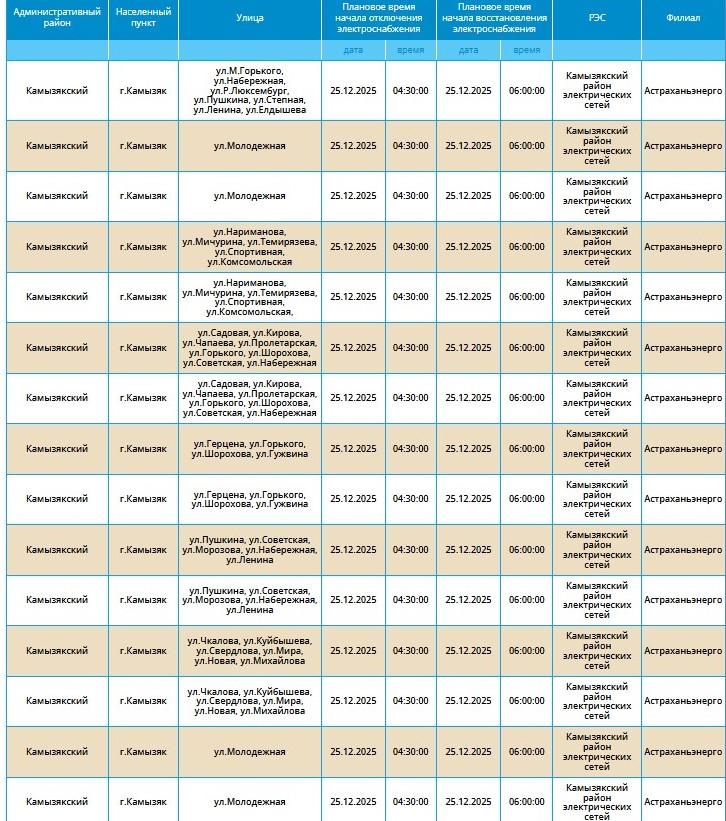 Массовые перебои в электроснабжении продолжатся и в четверг. 25 декабря отключат свет в ряде населенных пунктов Астраханской области. Расскажем, какие из них попали в число «счастливчиков».