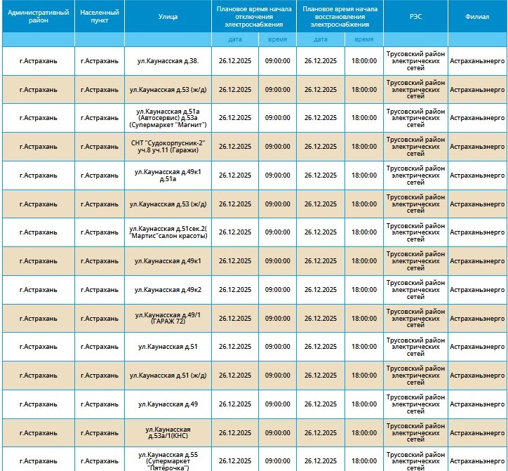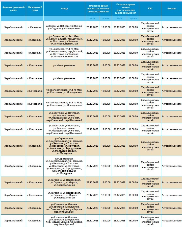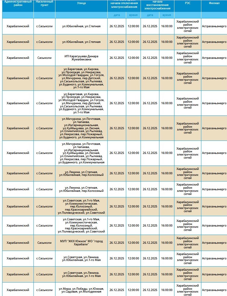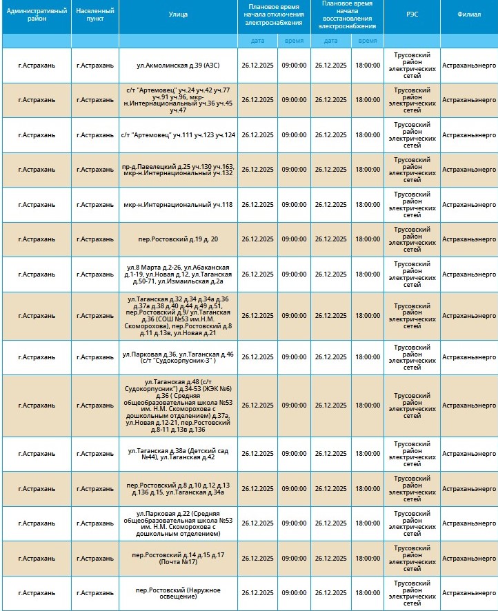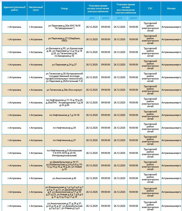Без электричества на несколько часов останутся десятки улиц в Астрахани, а также ряда сел, расположенных в Харабалинском и Приволжском районах. Список адресов «счастливчиков» смотрите в таблице ниже.