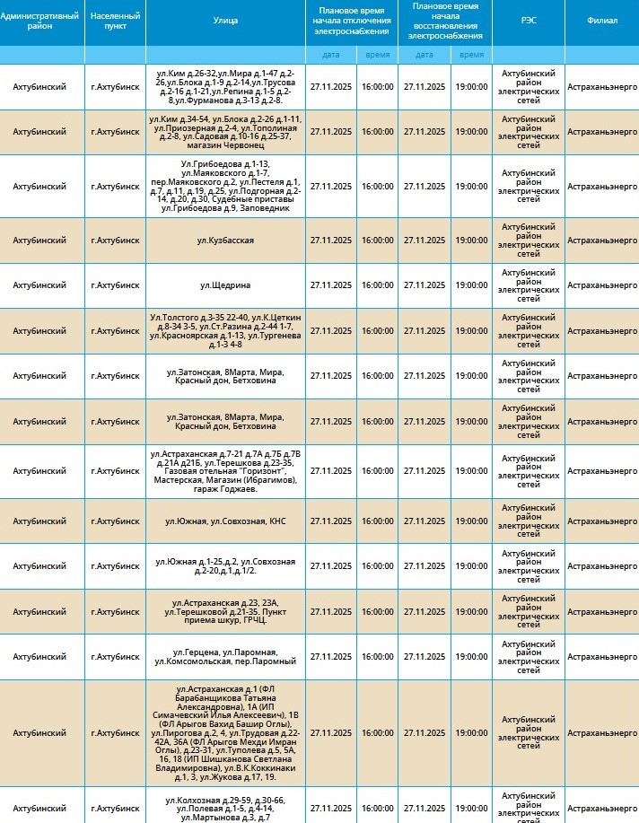 Без электричества на несколько часов останутся десятки улиц в Астрахани и Ахтубинске. А также более двадцати сел и поселков, расположенных в Ахтубинском, Приволжском, Камызякском, Харабалинском и Икрянинском районах.