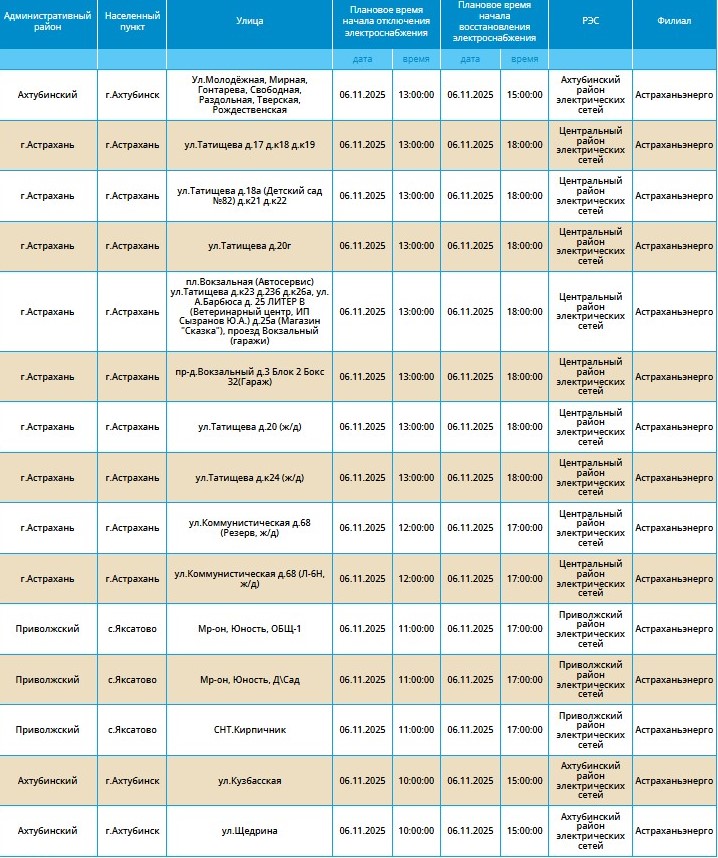 6 ноября отключение света грядет в Астрахани, Ахтубинске и селах