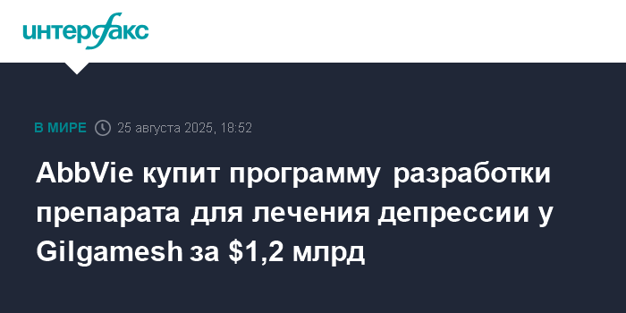 Москва. 25 августа. INTERFAX.RU - Американская фармацевтическая компания AbbVie Inc. покупает у Gilgamesh Pharmaceuticals Inc. операции по разработке препарата для лечения пациентов с умеренной и тяжелой клинической депрессией.