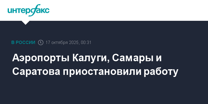 Москва. 17 октября. INTERFAX.RU - Аэропорты Калуги (Грабцево), Самары (Курумоч) и Саратова (Гагарин) приостановили обслуживание рейсов, сообщил представитель Росавиации Артем Кореняко.