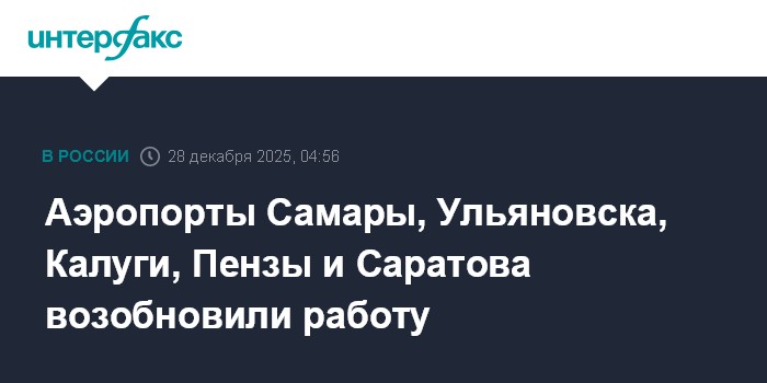 Москва. 28 декабря. INTERFAX.RU - Ограничения отменены в аэропортах Аэропорты Самары, Ульяновска, Калуги, Пензы и Саратова, сообщили в Росавиации.
