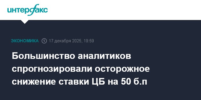 Москва. 17 декабря. INTERFAX.RU - Банк России в пятницу продолжит цикл смягчения денежно-кредитной политики (ДКП), считают аналитики. Большая часть экспертов прогнозирует снижение ставки на 50 базисных пунктов (б.п.) до 16%, другая часть экономистов ждет снижения на 100 б.п. до 15,5%.