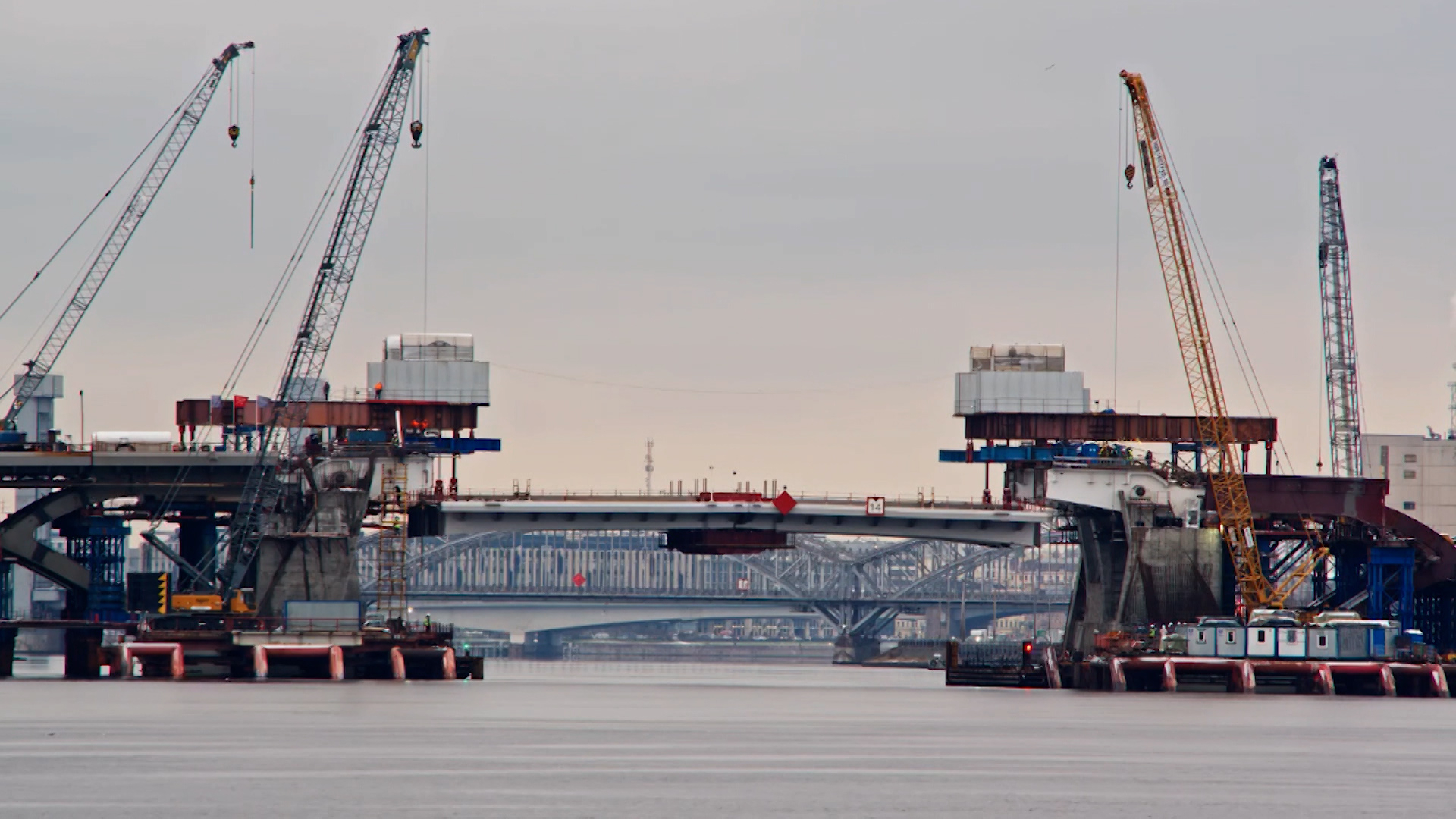 Под снегом к мосту на буксирах подвозили его самую значимую часть. Разводной пролет – гигантская конструкция. Вот так начиналась сложная инженерная операция на этом этапе строительства. Она продлится 50 часов.