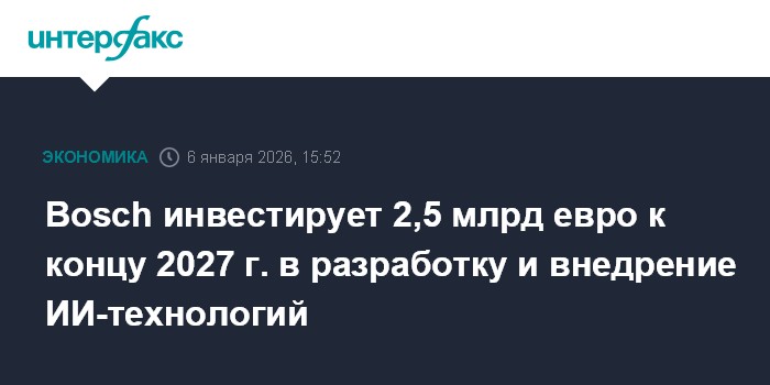 Москва. 6 января. INTERFAX.RU - Германская инженерная и технологическая компания Robert Bosch планирует инвестировать свыше 2,5 млрд евро к концу 2027 года в разработку и внедрение технологий искусственного интеллекта.