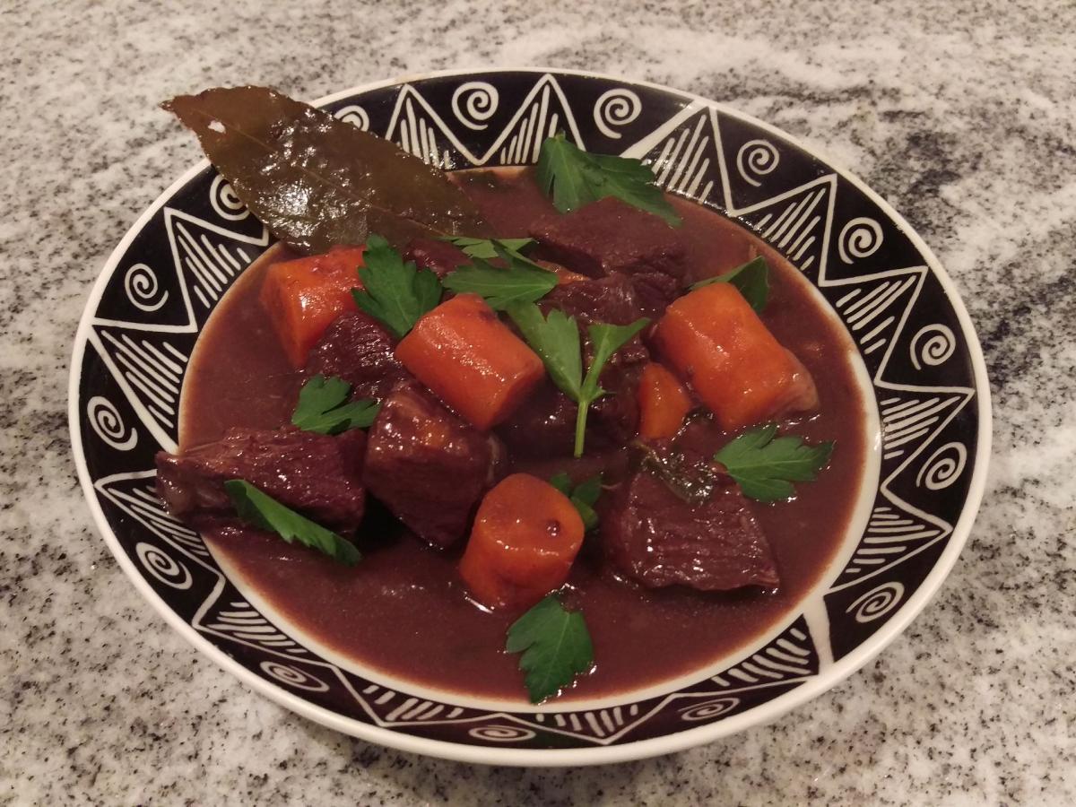 Ингредиенты для говядины по-бургундски (на 4 порции)• Говяжья щека — 1 кг• Красное сухое вино — 500 мл• Говяжий бульон — 1 л• Бекон — 150 г• Морковь — 2 шт.• Лук репчатый — 2 шт.• Чеснок — 3 зубчика• Шампиньоны — 200 г• Оливковое масло — 2 ст. ложки• Сливочное масло — 30 г• Букет гарни (лавровый лист, тимьян, петрушка) — 1 шт.• Крупная соль и свежемолотый перец — по вкусу