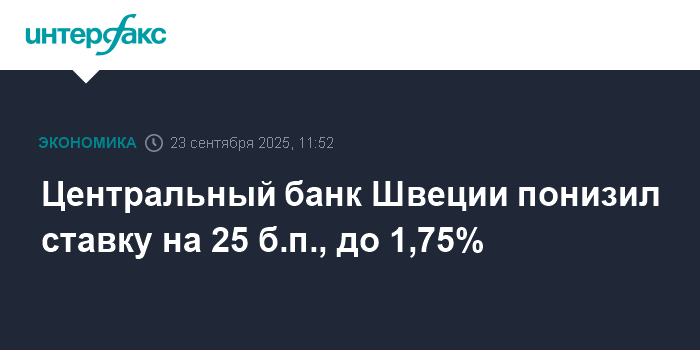 Москва. 23 сентября. INTERFAX.RU - Риксбанк (Центральный банк Швеции) понизил ключевую процентную ставку на 25 базисных пунктов - до 1,75% годовых. Решение стало неожиданностью для аналитиков, опрошенных Trading Economics, прогнозировавших сохранение ставки на прежнем уровне.