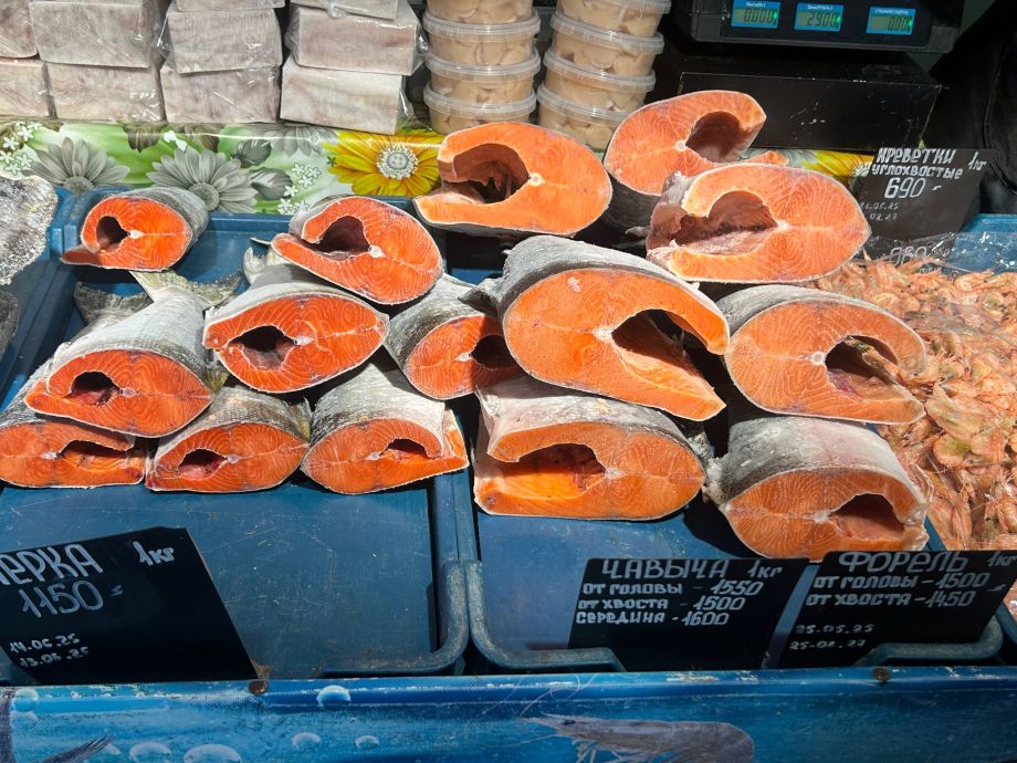 Красная рыба, как и ожидалось, самая дорогая. Килограмм нерки стоит от 1150 до 1200 рублей. Чавычу продают по частям: за килограмм от головы – 1550 рублей, от хвоста – 1500 рублей, а от середины – 1600 рублей. Но можно найти и по 1250 рублей. За форель просят от 1450 до 1500 рублей. Кета стоит от 250 до 790 рублей, сима – от 450 до 650 рублей, кижуч – от 800 до 850 рублей, горбуша – от 300 до 350 рублей.