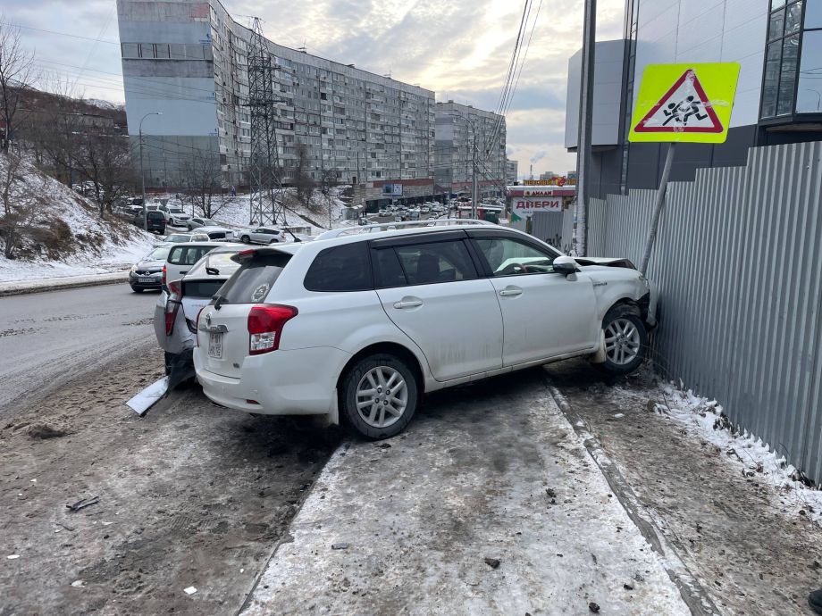 От удара Jimny отбросило в Toyota TownAce, а затем уже сам Fielder по инерции улетел на парковку и столкнулся с Toyota Prius, попутно погнув дорожный знак.