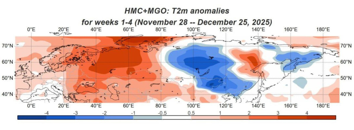 Гидрометцентр России совместно с Главной геофизической обсерваторией представил обновленный долгосрочный прогноз погоды на период с 28 ноября по 25 декабря 2025 года. Согласно модели ПЛАВ+ГГО, в районе Кировской области ожидается выраженная положительная температурная аномалия — около +4°С к средним многолетним значениям.