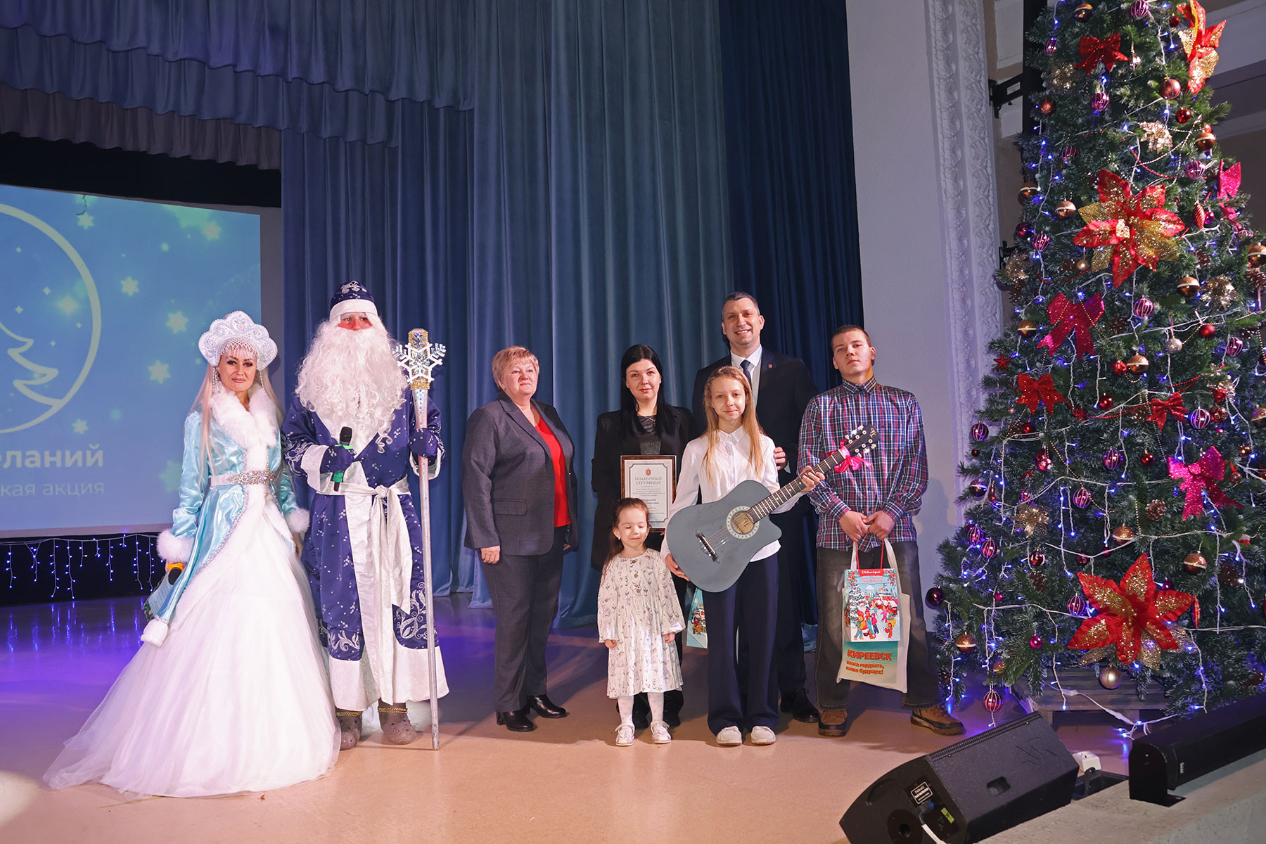 Девочка хорошо учится, занимается в музыкальной школе и посещает спортивную секцию. Она всегда мечтала научиться играть на гитаре. От имени губернатора его заместитель Ярослав Раков вручил Лене новый музыкальный инструмент и сертификат на обучение. Младшей сестре и старшему брату девочки также передали сладкие новогодние подарки.