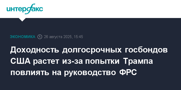 Москва. 26 августа. INTERFAX.RU - Доходность долгосрочных американских государственных облигаций поднимается во вторник на фоне попытки президента США Дональда Трампа уволить члена совета управляющих Федеральной резервной системы (ФРС) Лизу Кук.