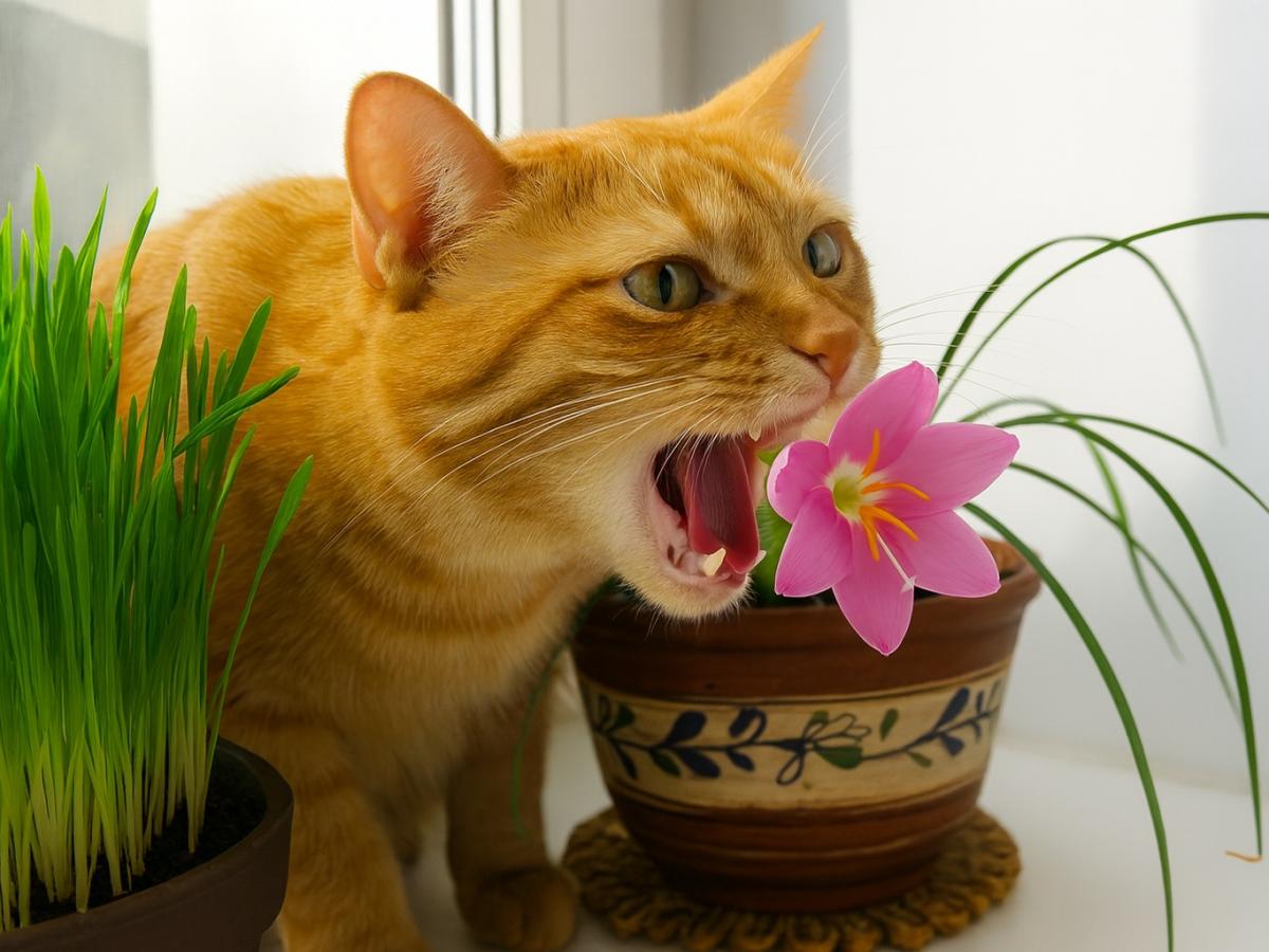 Фото: Generated by AI (DALL·E 3 by OpenAI) is licensed under Free for commercial use (OpenAI License) Кот ест цветок на подоконнике Почему кошки едят растения Естественная потребность организмаВ природе кошки охотятся и съедают добычу целиком — вместе с перьями, шерстью и костями. Чтобы помочь желудку избавиться от непереваримых остатков, животное ест траву, вызывая рвотный рефлекс и очищая пищеварительный тракт.
