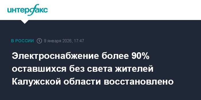 Москва. 9 января. INTERFAX.RU - Восстановлено электроснабжение более 90% жителей Калужской области, оставшихся без света из-за непогоды, сообщил губернатор региона Владислав Шапша в своем телеграм-канале.