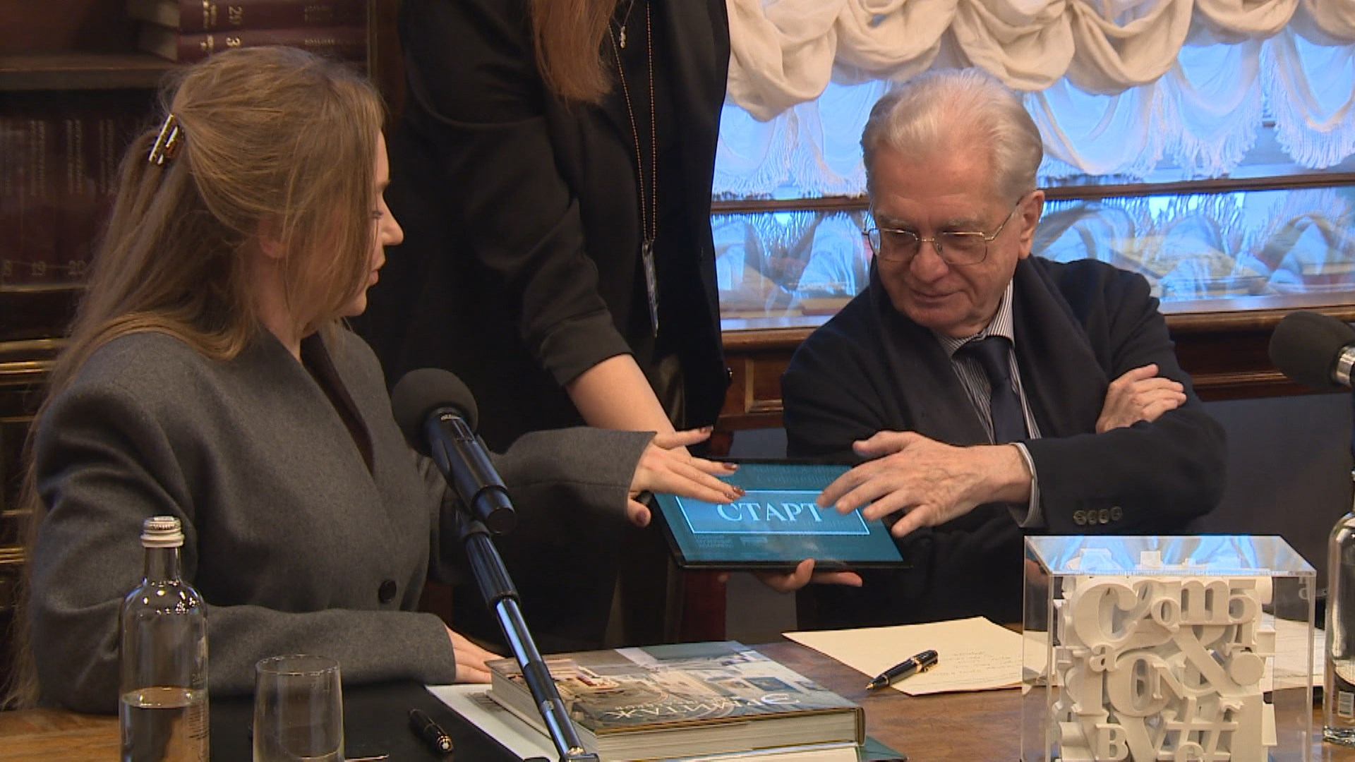 «Вот мы сегодня объявляем о новом шрифте и его используем. А используем его, в первую очередь, сейчас в электронных штучках – это то, что называется гаджет, по-русски – штучка. И в частности в телефоне, чтобы было удобно и красиво», – сказал директор Государственного Эрмитажа Михаил Пиотровский.