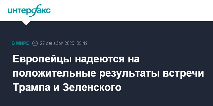 Москва. 27 декабря. INTERFAX.RU - В Европе рассчитывают, что планируемая в воскресенье встреча президентов США Дональда Трампа и Украины Владимира Зеленского позволит приблизить заключение мирного соглашения, сообщает CNN со ссылкой на анонимных европейских чиновников.