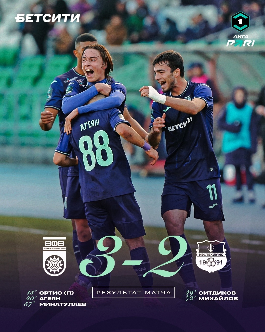 Со счетом 3:2 в пользу футбольного клуба «Уфа» завершился матч с командой «Нефтехимик» из Татарстана. На 15-й минуте удачное пенальти совершил Дилан Ортис (пенальти), на 40-й гол забил Мигран Агеян, а на 57-й победу «уфимцам» принес Осман Минатулаев.