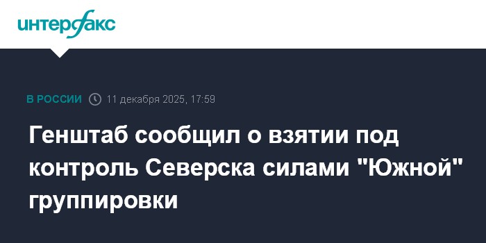 Москва. 11 декабря. INTERFAX.RU - Начальник Генштаба ВС РФ Валерий Герасимов заявил, "Южная" группировка войск взяла под контроль город Северск в ДНР.