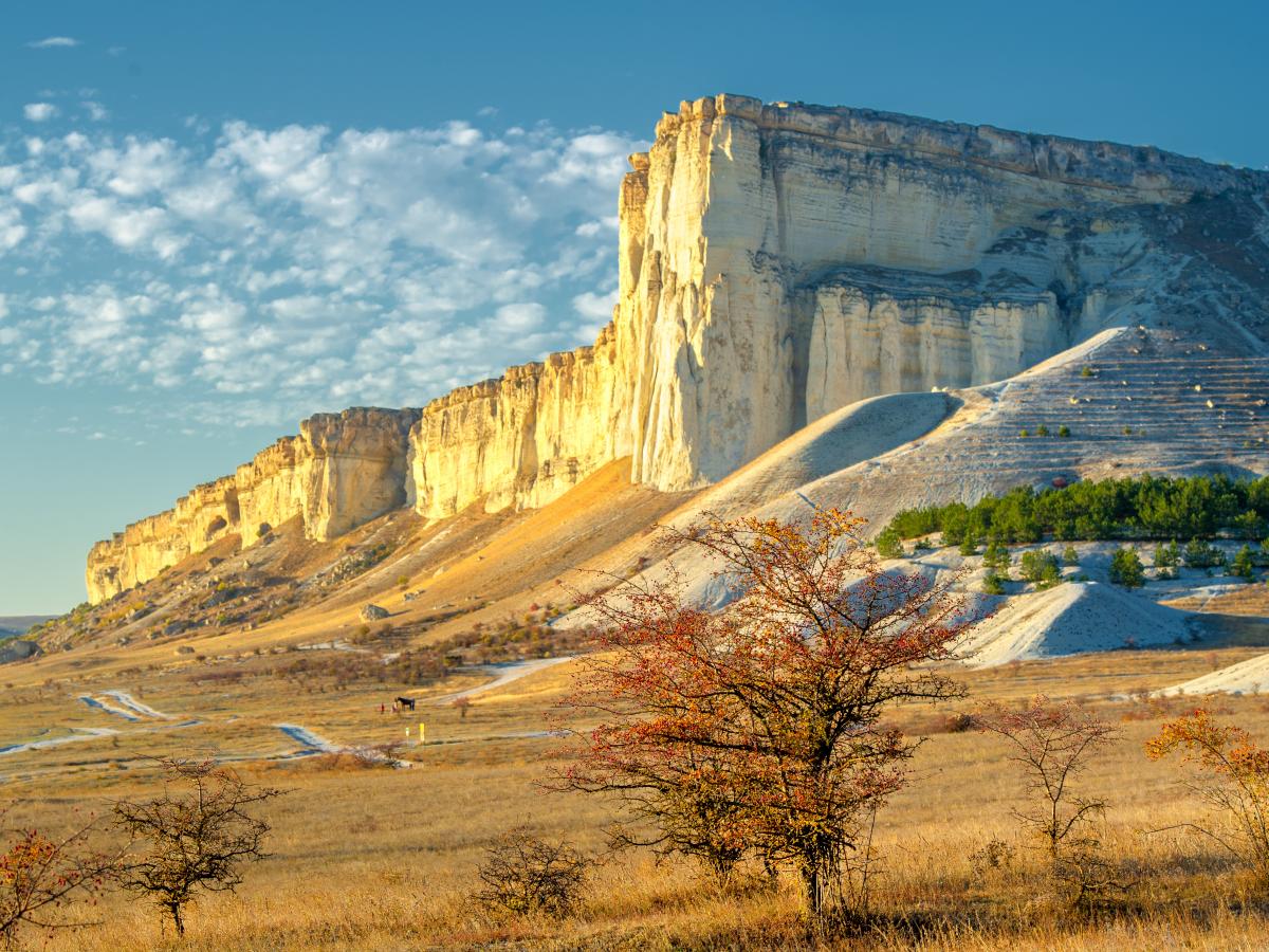 Дополнительная точка: Белая скалаЕсли есть день в запасе, можно свернуть в Белогорский район. Белая скала поражает масштабом: белый известняк, степь, огромный горизонт. Особенно красиво на закате. У подножия расположены атмосферные глэмпинги — вигвамы, А-фреймы, кафе с видом. Место спокойное, подходит для тех, кто хочет почувствовать другую сторону Крыма — степную и просторную.