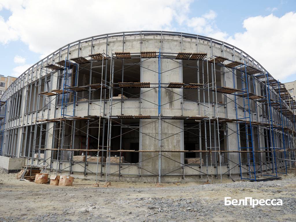«Мы приступили к фасаду – он будет весь стеклянный. Изначально срок по контракту – до 2027 года. Но, если всё будет хорошо, можем до 1 сентября завершить работы. Конечно, здание сложное: тут нет острых углов, много закруглений, несколько видов колонн. Сейчас все сложные работы уже выполнены, идёт отделка. Ежедневно тут работает по 55 человек, и работников становится всё больше. Делаем вентиляцию, электрику, отопление, завершаем кровлю, которая будет эксплуатируемой», – рассказал застройщик.
