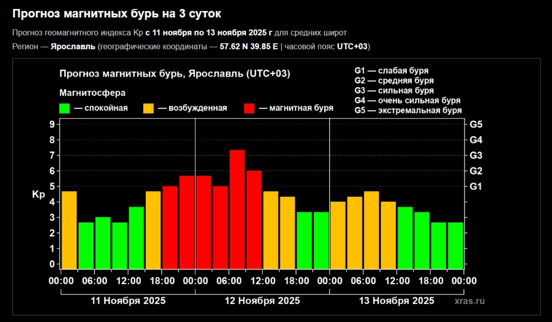 Между 6:00 и 9:00 12 ноября ожидается сильная магнитная буря. Показатели возмущения магнитосферы достигнут отместки G3.3 (Kp = 7.33).