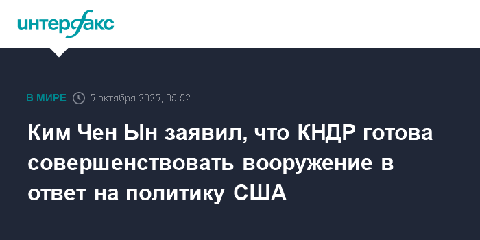 Москва. 5 октября. INTERFAX.RU - Политика США и наращивание ими вооруженных сил требует от КНДР совершенствования своих вооружений и военной техники, заявил северокорейский лидер Ким Чен Ын, которого цитирует Центральное телеграфное агентство Кореи (ЦТАК).
