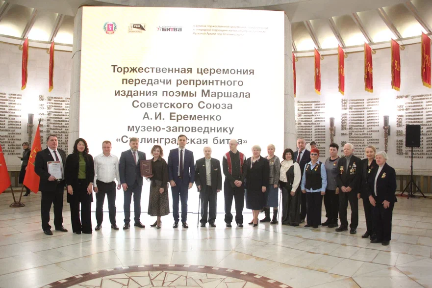 В музее-панораме «Сталинградская битва» состоялась торжественная церемония передачи репринтного издания поэмы Маршала Советского Союза Андрея Ивановича Еременко «Сталинград». Мероприятие было приурочено ко дню очередной годовщины начала контрнаступления советских войск под Сталинградом.