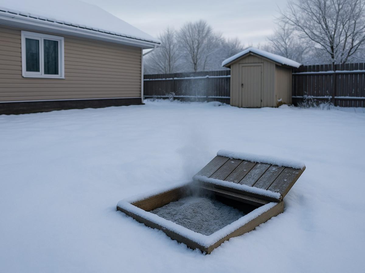 Фото: Generated by AI (DALL·E 3 by OpenAI) is licensed under Free for commercial use (OpenAI License) Зимний двор с открытым люком и домом Почему снег липнет к лопате и как помогает спрейКогда лезвие лопаты контактирует со снегом, особенно при температуре около нуля, часть массы начинает подтаивать от тепла воздуха и трения. Затем вода мгновенно подмерзает и образует тонкую ледяную плёнку — на неё налипает новый слой. Так лопата быстро "обрастает" тяжёлым комом, который приходится сбивать вручную.