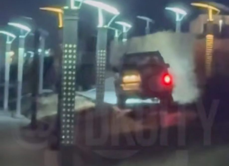 На кадрах видно, как внедорожник едет по пешеходной зоне возле дома 15А на улице Басаргина, задевает ограждения и выламывает столбы освещения.