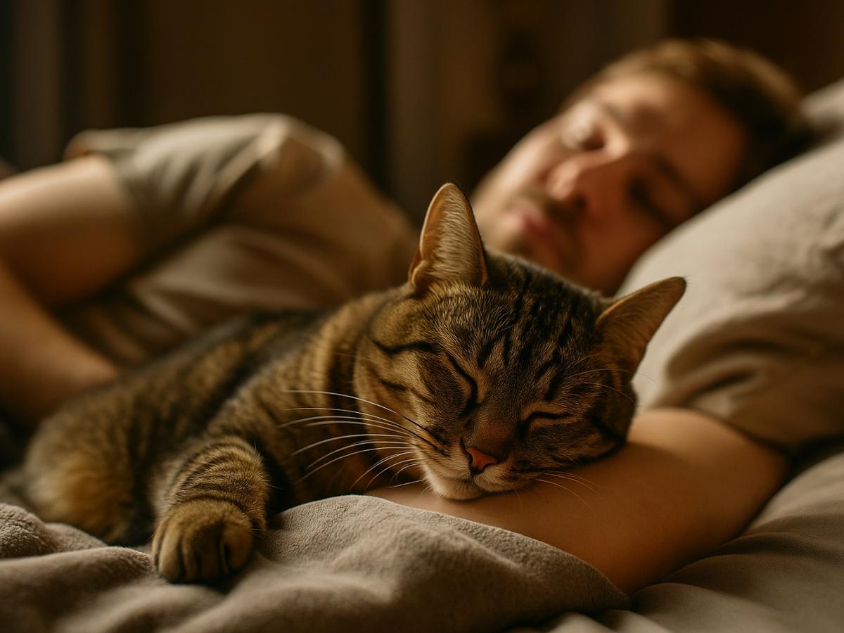 Фото: Generated by AI (DALL·E 3 by OpenAI) is licensed under Free for commercial use (OpenAI License) Кошка спит рядом с хозяином Кошачья любовь: как её распознатьКошки не выражают чувства громко и открыто, как собаки. Их язык — это поведение, позы и мелкие привычки. Если кошка любит своего человека, она будет рядом — буквально шаг в шаг. Она встречает вас у двери, ложится рядом, мурлычет и трётся мордочкой, "маркируя" запахом как часть своей семьи.