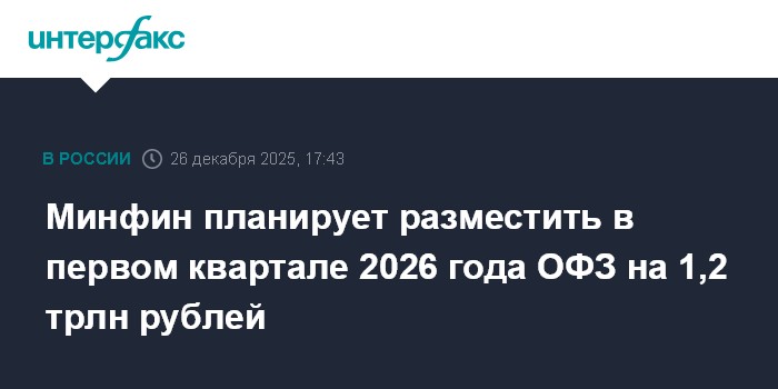 Минфин планирует разместить в первом квартале 2026 года ОФЗ на 1,2 трлн рублей