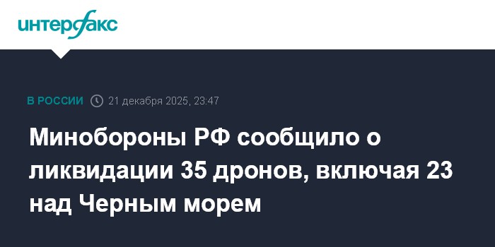 Москва. 21 декабря. INTERFAX.RU - Российскими военными с 20:00 до 23:30 мск воскресенья перехвачены и уничтожены 35 украинских беспилотников, сообщило Минобороны РФ.