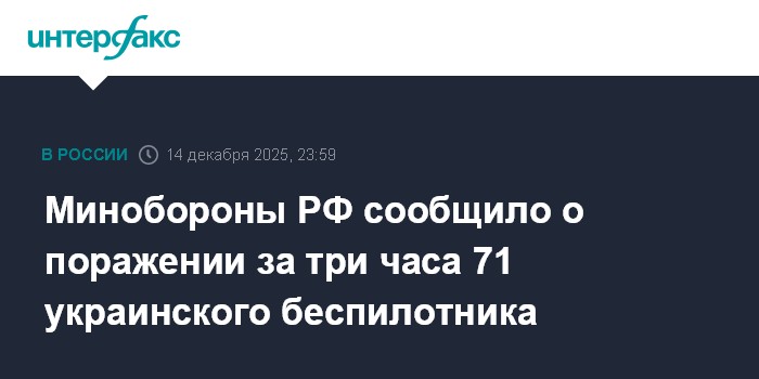 Москва. 14 декабря. INTERFAX.RU - Российские военные сообщили, что с 20:00 до 23:00 дежурными средствами ПВО перехвачен и уничтожен 71 украинский беспилотный летательный аппарат самолетного типа.