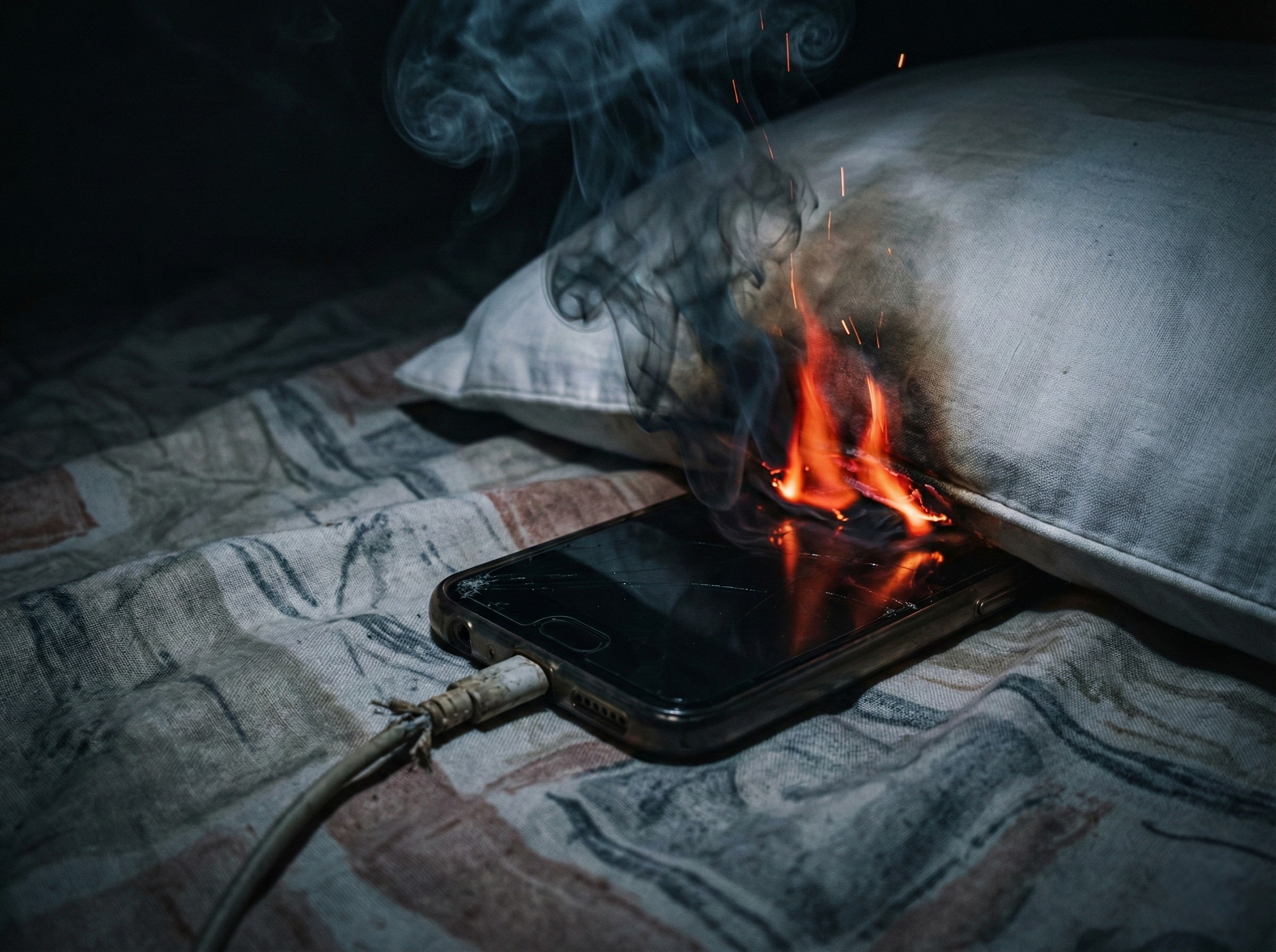 Когда это реально опасно: пожар на подушкеСтрашилки про сгоревшие квартиры — это не про перезаряд, а про перегрев и плохие аксессуары.