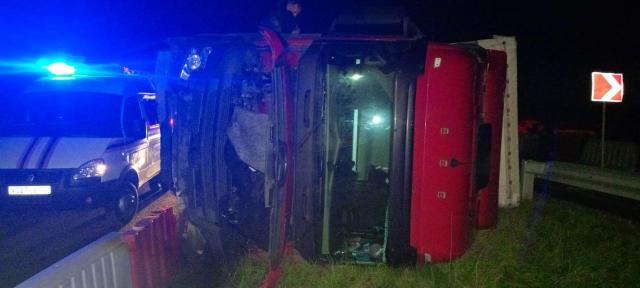 Водитель грузовика не справился с управлением, фура опрокинулась на бок.