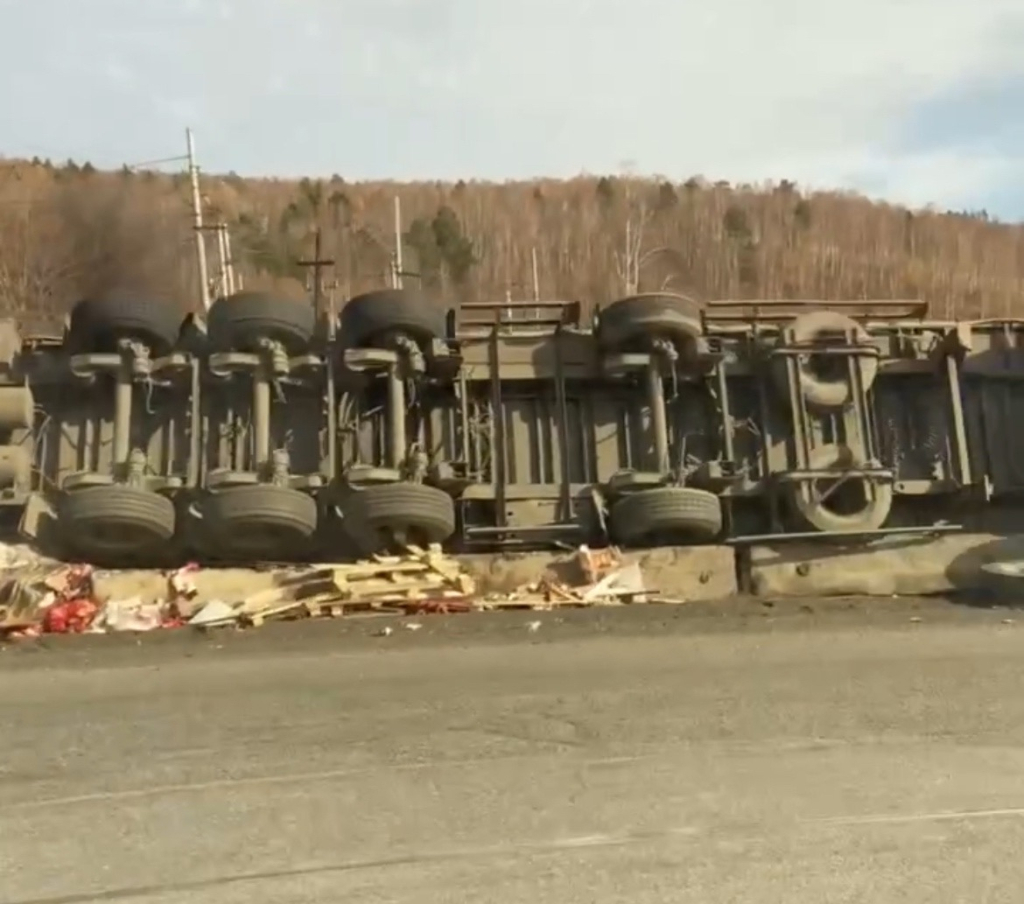Водитель большегрузного автомобиля не справился с управлением и опрокинулся. В результате происшествия повреждено дорожное ограждение.