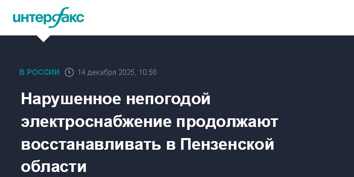 Москва. 14 декабря. INTERFAX.RU - Специалисты в Пензенской области продолжают работы по восстановлению электроснабжения, нарушенного непогодой, сообщил губернатор региона Олег Мельниченко в воскресенье.