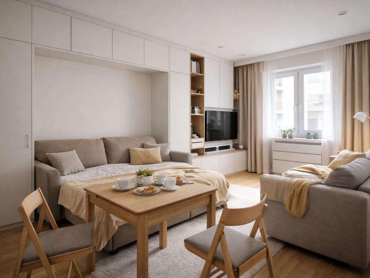 Фото: Сакиулова Ольга is licensed under Public domain Светлая квартира-студия Теплые оттенки вместо стерильной белизныЦветовая палитра интерьеров в 2026 году заметно смещается в сторону природных и мягких тонов. Белые стены уступают место кремовым, песочным и бежевым оттенкам, которые не утомляют взгляд и создают ощущение уюта. В оформлении активно используются коричневые, карамельные и приглушённые зелёные цвета, а также спокойные серо-голубые нюансы. Такая гамма хорошо сочетается с естественным освещением и подчёркивает переход к более тёплому и человечному пространству.