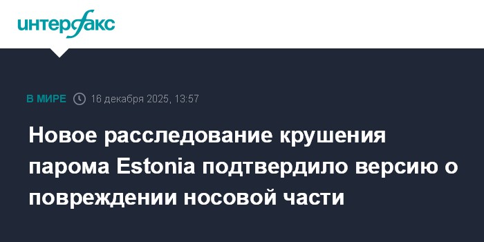 Москва. 16 декабря. INTERFAX.RU - Новое расследование крушения парома Estonia в Балтийском море в 1994 году, в результате которого погибли и пропали без вести 852 человека, подтверждает версию предыдущего расследования 1997 года, согласно которой трагедия произошла из-за повреждения носовой конструкции.