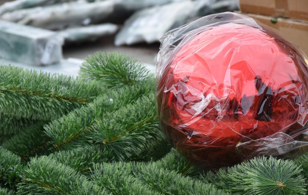 Для украшения подготовили около 400 шаров, 200 колокольчиков, 40 светодиодных снежинок и комплект гирлянд. Цветовая гамма традиционная для Нового года: красный и золотой.