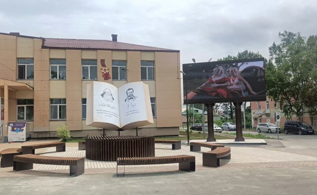 Огромную книгу с портретами Чехова и Толстого установили на площади в Долинске