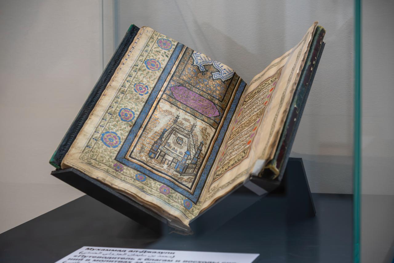 Еще одна необычная рукопись – «Путеводитель к благам и восходы сияний в молитвах за пророка-избранника» на арабском языке конца XVIII–XIX века из Ирана. Ее автор, Мухаммад ал-Джазули, марокканский суфийский шейх, считался потомком Пророка Мухаммада. Этот сборник молитв стал чрезвычайно популярным, в мире сейчас насчитывается несколько тысяч его рукописных списков.